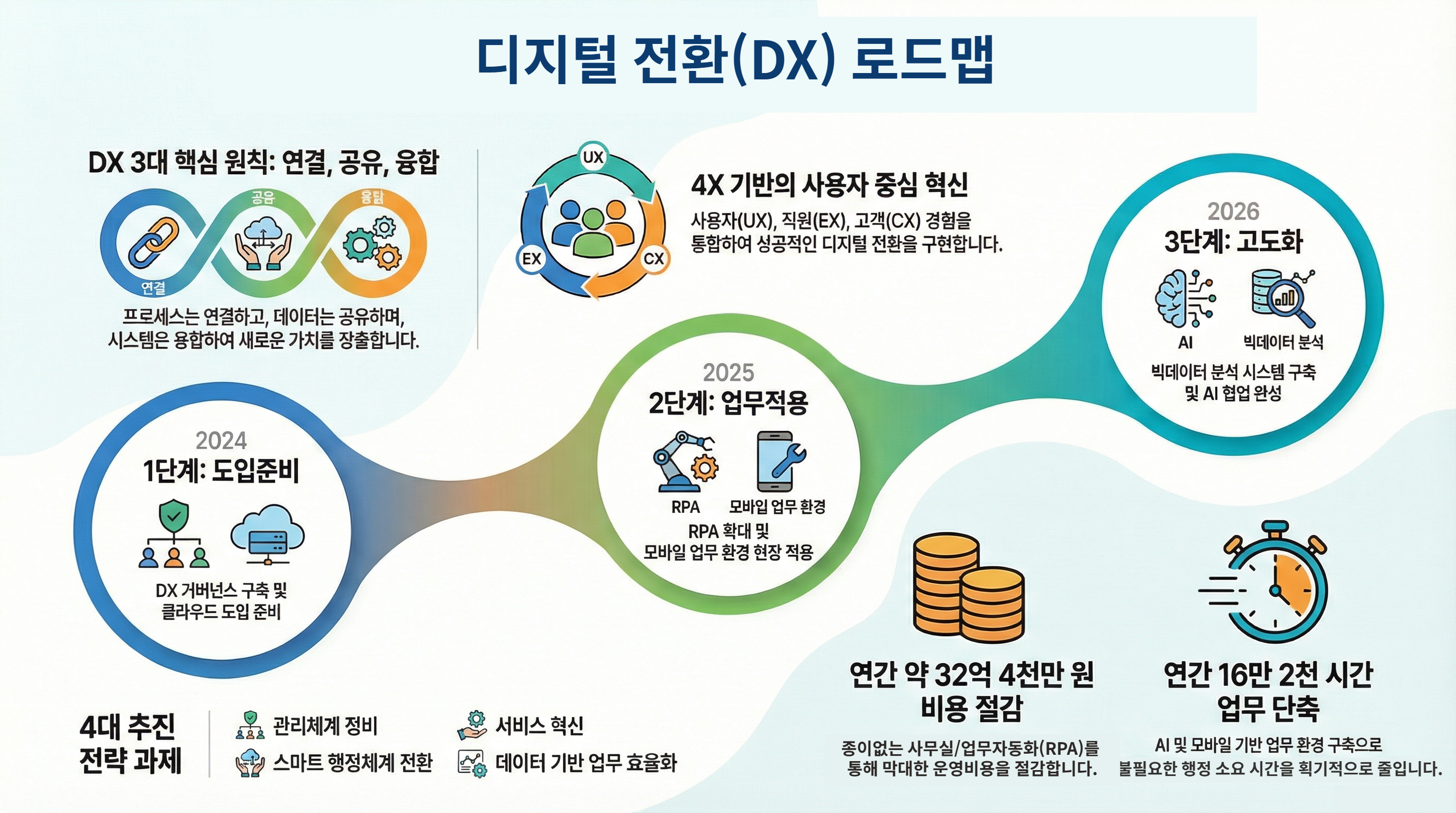 업무 자동화와 데이터 분석을 위한 디지털 전환 전략을 수립하고 실행합니다. 공기업 특성에 맞는 맞춤형 DX 로드맵을 제공합니다.